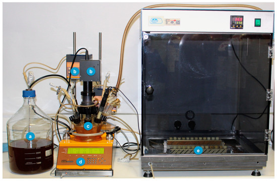 This dynamic in vitro biofilm model consists of a sterile vessel (Figure 7a), where the bacterial inoculum is placed within the modified BHI liquid culture medium, which is then pumped by a peristaltic pump, at constant pressure (Figure 7b), to a bioreactor (Lambda Minifor© bioreactor, LAMBDA Laboratory Instruments, Sihlbruggstrasse, Switzerland), that maintains the culture medium at 37 °C, pH 7.2 and constant anaerobic conditions (10% H2, 10% CO2, and balance N2), maintained by constant flow of the gas mixture (Figure 7c,d), thus mimicking the oral cavity environment. This culture medium is then continuously transferred (30 mL/h) through another peristaltic pump (Figure 7b) to the two Robbins devices serially placed (Figure 6), within a laboratory stove to keep controlled temperature (37 ºC) and containing the sterile implants under anaerobic conditions (Figure 7e).