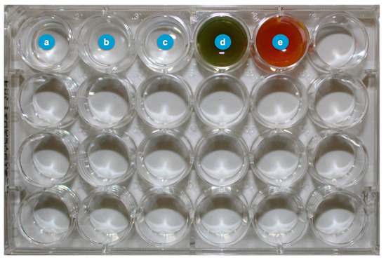 Microplate wells with the decontamination groups (a) phosphate-buffered saline (PBS), (b) chlorhexidine (CHX), (c) dimethyl sulfoxide (DMSO), (d) xanthohumol and (e) curcumin.