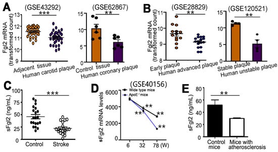 sFgl2 decreased in both human and mouse atherosclerotic diseases. (A) Quantification of sFgl2 mRNA relative expression between human carotid plaques and adjacent carotid tissues from microarray data (GSE43292) and between human coronary plaques and control tissues (GSE62867). (B) Quantification of sFgl2 mRNA relative expression between advanced human plaques and early plaques (GSE28829) and between human unstable plaques and stable plaques (GSE120521). (C) Elisa assay detected changes of sFgl2 protein levels in the plasma of healthy controls (N = 20) and acute stroke patients (N = 20). (D) In the aorta of wide-type or ApoE-/- mice fed a Western diet, sFgl2 gradually decreased with time. (E) sFgl2 decreased in atherosclerotic mice compared with controls. ** p < 0.01, *** p < 0.001. Data were represented as mean ± SEM.