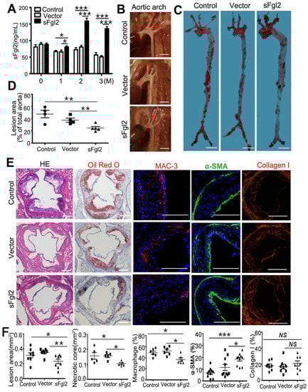 Plasma sFgl2 was evaluated by ELISA after 0, 1, 2, and 3 months of PBS, Vector-AAV, or sFgl2-AAV injected into the tail veins of ApoE−/− mice. The results showed sFgl2-AAV could stably upregulate the expression of sFgl2 compared with controls after 1, 2, and 3 months of virus or PBS injection (Figure 2A).