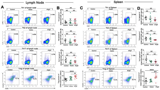 sFgl2-AAV increased the proportion of Tregs and had no impact on Th1, Th2, and Th17 cells’ percentage in the lymph nodes and spleen of atherosclerotic mice. (A) Representative flow cytometry analysis of Th1 (CD45+CD3+CD8-CD4+IFN-γ+), Th2 (CD45+CD3+CD8-CD4+IL-4+), Th17 (CD45+CD3+CD8-CD4+IL-17+), and Treg (CD45+CD3+CD4+ CD25+Foxp3+) cells in spleen of PBS-, Vector-AAV-, and sFgl2-AAV- tail-vein-injected ApoE-/- mice. Left plots show gating of IFN-γ+, IL-4+, IL-17+, and Foxp3 by FCM. (B) Quantification results of (A). (C,D) Representative flow cytometry analysis and quantification results of Th1, Th2, Th17, and Treg cells in lymph nodes of the above mice. NS = Not significant, * p < 0.05, ** p < 0.01, *** p < 0.001. Data were represented as mean ± SEM.