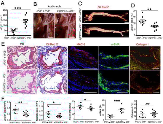 Neutrophils are also important cells involved in the progression of atherosclerosis [,]. Since some studies have reported BMT could change the population of neutrophils [], we detected the numbers of neutrophils in peripheral blood by flow cytometry to exclude its possible interfering effect and found no difference in neutrophils among subgroups of two models. Additionally, lipids also play an important role in the development of atherosclerosis, and no significant changes, including total cholesterol and triglycerides, were detected in our experiment across sFgl2 overexpression and control groups (Supplementary Table S1).