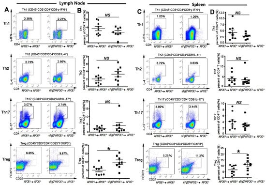 Over-expression of bone-marrow-derived sFgl2 increased Treg differentiation without affecting the population of T helper cells. (A) Representative flow cytometry analysis of Th1 (CD45+CD3+CD8-CD4+IFN-γ+), Th2 (CD45+CD3+CD8-CD4+IL-4+), Th17 (CD45+CD3+CD8-CD4+IL-17+), and Treg (CD45+CD3+CD4+CD25+Foxp3+) cells’ percent among CD4+ T cells in spleen of irradiated ApoE-/- mice reconstituted with sFgl2TgApoE-/- or ApoE-/- bone marrow. Numbers represented the percentage of Th1, Th2, Th17, and Treg cells in CD4+T cells. (B) Quantification results of (A). (C) FCM analysis of Th1, Th2, Th17, and Treg cells percent among CD4+ T cells in lymph nodes of irradiated ApoE-/- mice reconstituted with sFgl2TgApoE-/- or ApoE-/- bone marrow. (D) Quantification results of (C). NS = Not significant, * p < 0.05. Data were represented as mean ± SEM.