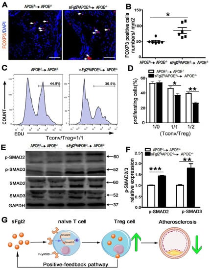 Bone marrow-derived sFgl2 increased the Tregs population and immunosuppressive function by binding to FcγRIIB receptors and phosphorylating Smad2/3. (A) Immunofluorescent staining and (B) quantification of Foxp3 in the aortic root cross-sections of the irradiated ApoE-/- mice reconstituted with sFgl2TgApoE-/- or ApoE-/- bone marrow. Triangles indicate positive stained cells. Scale bar = 100 μm. (C) Firstly, CD4+CD25- (TConv) cells from WT mice and CD4+CD25+ (Treg) cells from two groups of irradiated mice were sorted by FACS. Then, the EDU-labeled TConv cells were co-cultured with Treg cells at ratios of 1/0,1/1, and 1/2 on CD3/CD28 pre-incubated plates. Representative histograms for TConv proliferation were shown. (D) Bars represent the percentage of proliferating TConv cells, (N = 3). (E) Representative Western blot gel depicts the protein expression of phosphorylated SMAD2/3 (p-SMAD2/3) and total levels of SMAD2/3 in the above mice. (F) The relative percent of p-Smad2/3 in total Smad2/3, (N = 4). (G) Schematic diagram depicting the positive-feedback pathway between sFgl2 and Treg to protect against atherosclerosis. * p < 0.05, ** p < 0.01, *** p < 0.001. Data were represented as mean ± SEM.