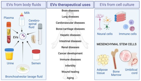 EVs can also be isolated from cell cultures for therapeutical purposes. The majority of EVs obtained in vitro come from mesenchymal stem cell (MSC) cultures, and among them, the most widely used are bone marrow MSC, umbilical cord MSC, and adipose-derived MSC (Figure 1).