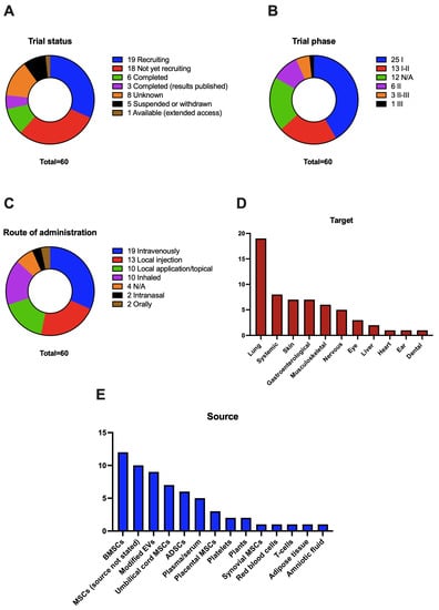 Graphical representation of the analysis of Table 1 results regarding ongoing and finalized clinical trials that use EVs therapy as the main intervention. (A): Trial status defined by clinicaltrials.gov. (B): Trial phase defined by clinicaltrials.gov, when the phase is not available or is not applicable N/A is shown. (C): Route of administration of the EV preparation, when not stated N/A is shown. (D): Organs or systems related to the primary outcome measured in the trial. (E): Source of the EVs used in the trial.