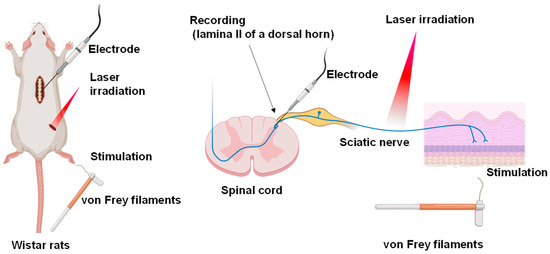 Schematic diagram of our experimental setup. Electrodes were inserted into lamina II of a rat spinal dorsal horn for recording. The skin of the right hind leg was incised to expose the sciatic nerve and irradiated with a laser. Mechanical stimulation with von Frey filaments (vFF) was applied to the cutaneous receptive field.