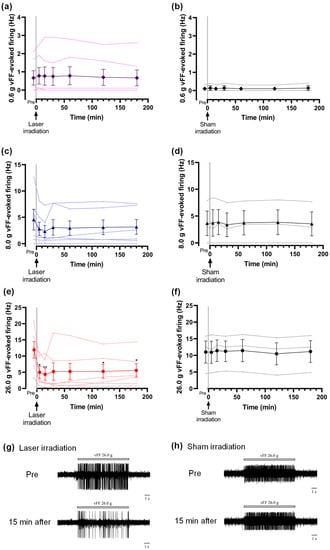 Laser irradiation had no effect on the 0.6 and 8.0 g vFF-evoked firing frequency (Figure 2a,c). Laser irradiation significantly reduced the 26.0 g vFF-evoked firing frequency. The decrease in firing frequency was observed 5 min after the irradiation and continued for 3 h (Figure 2e,g). Sham irradiation (only the placement of a laser irradiation probe) had no effect on vFF-evoked firing frequency (Figure 2b,d,f,h).