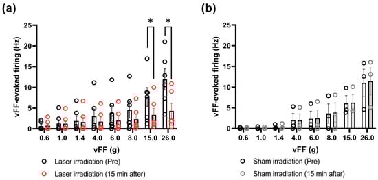 Comparison of frequencies among the 0.6, 1.0, 1.4, 4.0, 6.0, 8.0, 15.0, and 26.0 g vFF-evoked firing at 15 min after laser irradiation, when the 26.0 g vFF-evoked firing was the most inhibited. (a) The 15.0 and 26.0 g vFF-evoked firing was significantly inhibited while there were no significant differences in the 0.6, 1.0, 1.4, 4.0, 6.0, and 8.0 g vFF-evoked firing. (b) There were no significant differences for all vFFs after sham irradiation. The data are presented as the means ± SEM; * p < 0.05 vs. Pre using Wilcoxon matched-pairs signed-rank test (n = 3–6); vFF, von Frey filaments; SEM, standard error of the mean.