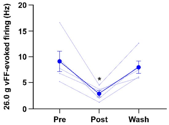 Administration of 0.5% lidocaine to the vFF stimulation site significantly inhibited the 26.0 g vFF-evoked firing frequency. After the wash, the firing frequency returned to the initial level. The data are presented as the means ± SEM; * p < 0.05 vs. Pre using Dunnett’s multiple comparison test (n = 5); vFF, von Frey filaments; SEM, standard error of the mean.