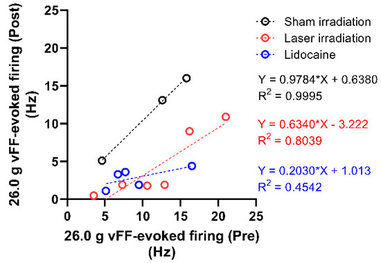 Correlations of the 26.0 g vFF-evoked firing frequency before and after intervention were compared between sham irradiation, laser irradiation, and lidocaine (Figure 5). The correlation coefficients were r = 0.9998, 0.8966 (95% confidence interval (CI): 0.312–0.9887) and 0.6739 (95% CI: −0.5139–0.9759) for sham irradiation, laser irradiation, and lidocaine, respectively. The degree of decrease in the correlation coefficient from 1.000 corresponds to the effect of the intervention. The slopes were 0.9784, 0.6340, and 0.2030 for sham irradiation, laser irradiation, and lidocaine, respectively (Figure 5).