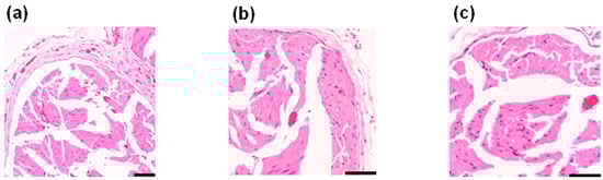 Bilateral sciatic nerves of the sham- and laser-irradiated rats were evaluated for pathology by HE staining (n = 3 each). There were no differences in findings between all the conditions, and no histopathological changes such as nerve damage due to laser irradiation were observed. (a) Representative image of the left sciatic nerve of sham-irradiated rats (intact). (b) Representative image of the right sciatic nerve of sham-irradiated rats (nerve exposed). (c) Representative image of the right sciatic nerve of laser-irradiated rats (nerve exposed). Black bars: 50 µm.