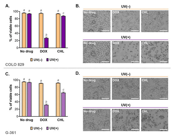 Viability of melanoma cells exposed to doxycycline and chlortetracycline as well as UVA radiation (A,C). The results were expressed as mean values ± SD. Sample microscopic images showing morphology of the tested melanoma cell cultures after the investigated treatment (B,D). Scale bar 250 µm. Using different letters to show statistical significance.