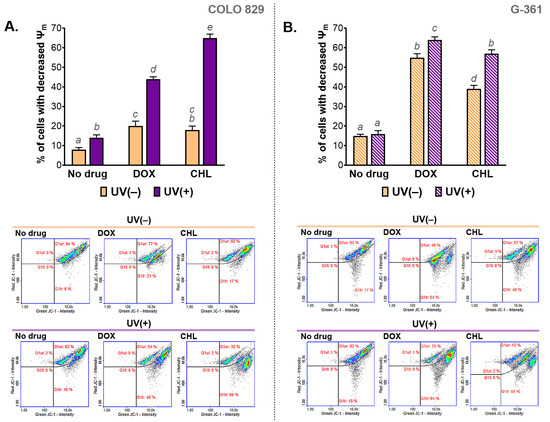 The influence of the cytotoxic and phototoxic action of DOX and CHL on mitochondrial membrane potential (MMP) was measured cytometrically. The obtained results are presented in Figure 4 as bar graphs and representative scatter plots. The analysis indicated that the melanoma cells treated with CHL or DOX were characterized by a decreased mitochondrial membrane potential. Stronger action was observed for G-361 melanoma cells. In this case, the percentage of cells with a depolarized mitochondrial membrane was about 40% and 54% for chlortetracycline and doxycycline, respectively. The exposure of cells to UVA radiation enhanced the effect of drugs, regardless of the cell line. Of note, a greater increase in the population of cells with reduced MMP was found for COLO 829. The increase was from 17% to 66% for CHL and from 21% to 46% for DOX. The corresponding results for the G-361 cell line were from 40% to 55% and from 54% to 64%, respectively.