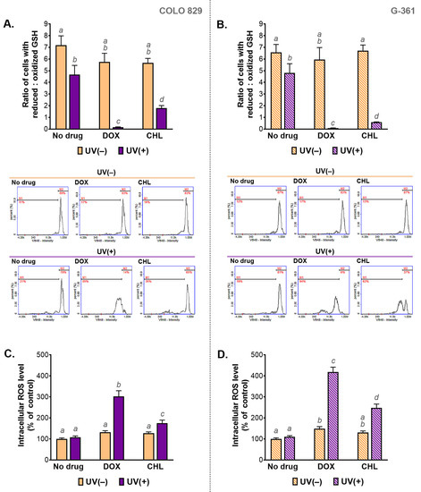The analysis of the intracellular level of thiols (A,B) and reactive oxygen species (C,D) in melanoma cells treated with doxycycline and chlortetracycline and irradiated with UVA. Bar graphs present mean values ± SD. Included histograms are representative results of cytometric analysis of thiols. Using different letters to show statistical significance.