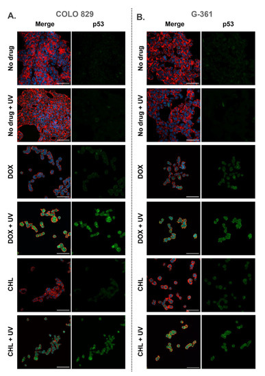 Confocal imaging of COLO 829 (A) and G-361 (B) melanotic melanoma cells treated with doxycycline and chlortetracycline and exposed to UVA radiation. The figure present merged images (nuclei—blue, actin cytoskeleton—red, and p53—green) as well as the separate channel visualizing p53. Scale bar 50 µm.