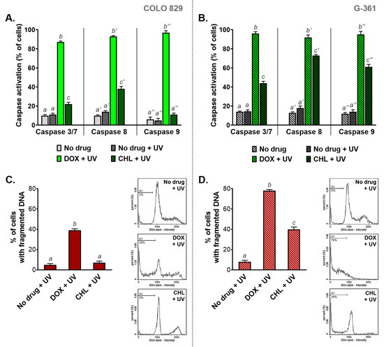 The analysis of caspase activation (A,B) and DNA fragmentation (C,D) in melanoma cells treated with doxycycline and chlortetracycline and irradiated with UVA. Bar graphs present mean values ± SD. Included histograms are representative results of cytometric analysis of DNA fragmentation. Using different letters to show statistical significance.