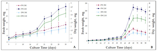 Prior to the assessment of the in vitro growth characteristics of S. betulifolia ssp. aemiliana, microshoots were cultured for three passages in the hormone-free MS solid or liquid medium (without agar); the passage duration was 45 days. Culture growth dynamics were studied during the fourth passage. Explants (microshoots with 3–5 nodes) were pre-weighed under aseptic conditions. In the solid medium, 5–6 explants were cultured in a jar. In the liquid medium, each explant was cultivated individually in 50 mL Erlenmeyer flasks on a shaker tray (ELMI, S-3-02 L, Riga Latvia) at 100 rpm, while the volume of the medium in the flask did not exceed 5 mL. Samples were taken on days 3, 7, 10, 14, 17, 21, 25, 28, 35, 42, 49, 60, 70, 80, and 90 and weighed. Growth curves were constructed for wet and air-dry weights of the biomass. The air-dry weight was measured after drying the material at room temperature in the shade. For each data point in the graph, 10–20 explants were used. The growth index was calculated by means of the formula [60]: