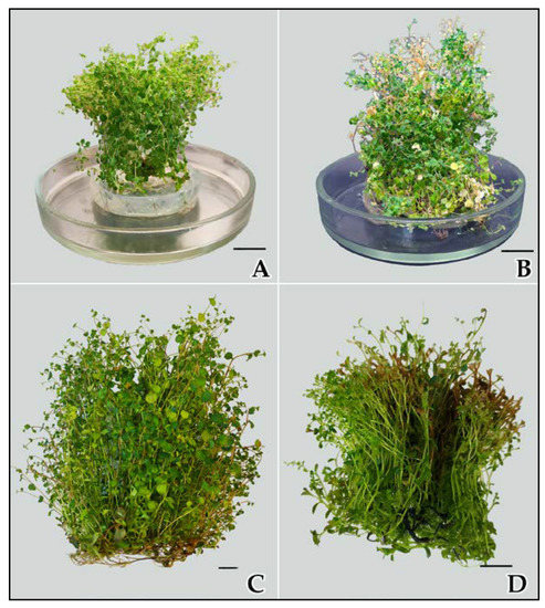 Microshoots of S. betulifolia ssp. aemiliana after (A) 60 days, (B) and 90 days of culturing in the agar-solidified medium, and after (C) 60 days, (D) and 90 days of culturing in the liquid medium. Scale bar: 1 cm.