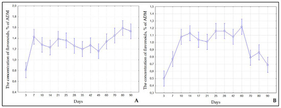 The concentration of flavonoids in microshoots of S. betulifolia ssp. aemiliana cultured in (A) agar-solidified (B) and liquid media.