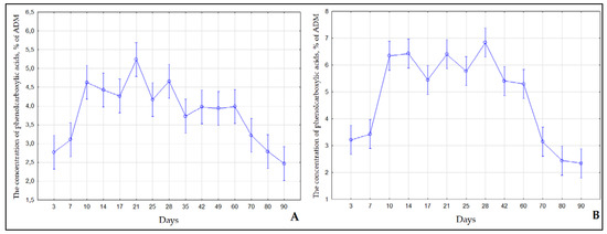 We analyzed the dynamics of the accumulation of flavonoids and phenol carboxylic acids in microshoots of S. betulifolia ssp. aemiliana cultured in solid (MshS) and liquid (MshL) media for 90 days. An analysis of water-ethanol MshS extracts showed that the flavonoid level was the lowest (0.81%) on day 3 (lag phase) (Figure 3a). From day 7 to day 90, the flavonoid content of MshS went up and varied within 1.16–1.59%. The flavonoid concentration in microshoots of S. betulifolia ssp. aemiliana cultured in the liquid medium differed from that in the solid medium. In the liquid medium, the flavonoid content was low on days 3 (0.5%) to 7 (0.77%). Then, during the period of active growth from day 10 to day 60, the flavonoid content of microshoots reached a plateau and attained its maximum (1.01% to 1.22%). During the degradation phase, the flavonoid level decreased, and from day 70 to day 90, it ranged from 0.69% to 0.87%. Concentrations of phenolic compounds, in particular flavonoids, changed in the S. betulifolia ssp. aemiliana microshoot culture since phenolic compounds are metabolically active plant compounds [34]; they are characterized by relatively rapid turnover and degradation. For example, phenols may be involved in various biosynthetic processes, undergo catabolism with subsequent conversion into primary metabolites, or participate in oxidative polymerization reactions, which cause the formation of insoluble structures of high molecular weight [34]. Therefore, it is worthwhile to identify the stage when culture productivity reaches its maximum.