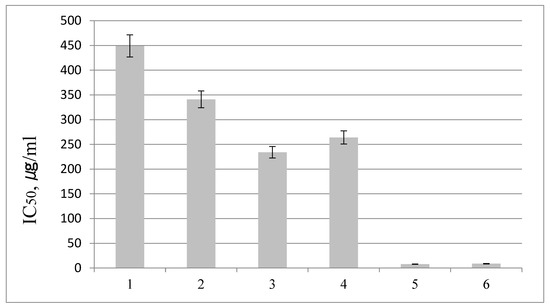 The results were expressed in IC50, defined as the concentration of an antioxidant that causes 50% DPPH loss in the DPPH radical–scavenging activity assay. Trolox (Acros Organics, Geel, Belgium) and Ascorbic acid (Reahim, Samara, Russia) solutions (2.5–50.0 µg/mL) were positive controls.