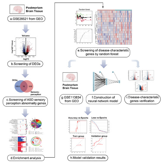 Herein, we used data from the Gene Expression Omnibus (GEO) database to screen for genes involved in ASD sensory perception and integrated these genes to establish the first artificial neural network model of ASD sensory perception abnormality. In addition, we used the recognized mouse model of ASD, the BTBR T+ Itpr3tf/J (BTBR) mouse, for verification of our findings. The analytical processes used in our study are shown in Figure 1. The results of this study may be useful for the early identification and diagnosis of sensory perception abnormality in ASD, and it may provide some insights into early targeted intervention in children with ASD.