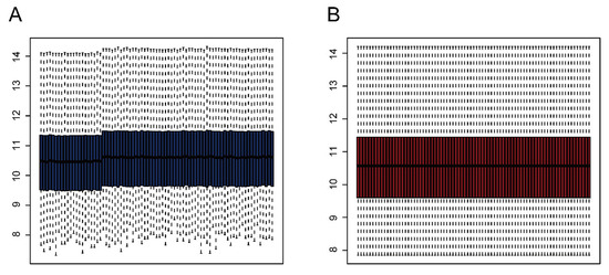 Data correction. (A) Box plot before data correction. (B) Box plot after data correction.