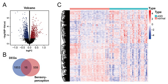 Identification of DEGs in ASD and ASD sensory perception abnormality-related genes. (A) Volcano plot of DEGs in ASD. The red color represents up-regulated genes, and the blue color represents down-regulated genes. (B) Venn diagram of DEGs in ASD and sensory perception genes. (C) Heatmap of DEGs in ASD. Red indicates the upregulated genes, and blue indicates the downregulated genes.