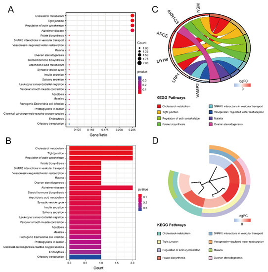 The results of KEGG enrichment analysis. (A) KEGG enrichment bubble plot. The x-axis represents the gene ratio, and the y-axis represents the p-value of different pathways. The size of the bubble indicates the number of genes enriched in each KEGG pathway. The redder the color, the smaller the p-value. (B) KEGG enrichment bar graph. The redder color indicates a smaller p-value. (C) KEGG enrichment chord plot. Genes are shown on the left, where red gene bands indicate up-regulated expression, and blue gene bands indicate down-regulated expression. The different colored bands on the right represent different pathways. Lines connect genes and their corresponding pathways. (D) KEGG enrichment phylogenetic plot. The bands with different colors in the innermost circle represent different genes, and the bands with different colors in the outer circle represent the enriched pathways of the corresponding genes.