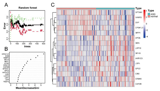 Figure 6A shows the relationship between the number of decision trees and the error rate. As shown in Figure 6B, EPB41L3 and MSN were identified as the most relevant genes, followed by VAMP2, MYH9, MPP1, and APOE. Based on the top 15 candidate genes, we performed unsupervised clustering on the GSE28521 dataset and drew a heatmap (Figure 6C), which showed that these 15 genes could distinguish between ASD and control samples among the 79 samples in the GSE28521 dataset.