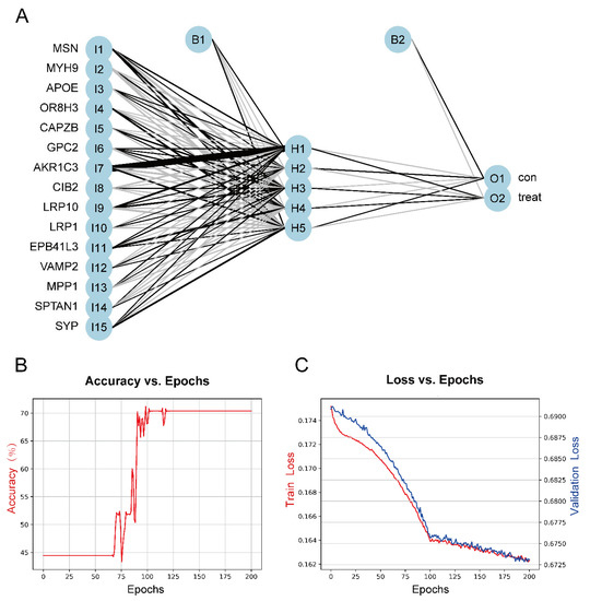 (A) The visualization of the neural network results. (B) Figure of accuracy vs. epochs. (C) Figure of loss vs. epochs.