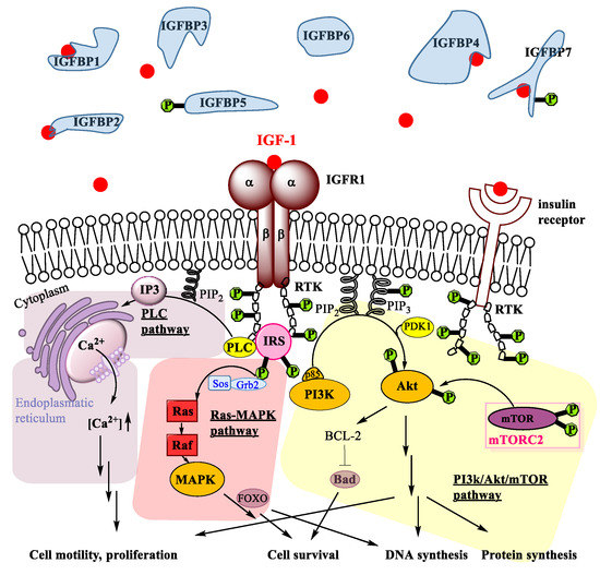 Regarding the mechanisms of action, IGF-1 binding to IGF1R receptor regulates several pathways. The IGF1R receptor is a hetero-tetramer with two extracellular α subunits and two transmembrane β subunits. Upon binding of IGF-1, the receptor tyrosine kinases (RTKs) are activated [34]. The tyrosine residues of RTKs are bound to the β subunits of IGFR1 and are phosphorylated upon IGF-1 binding to IGF1R (Figure 1; see Abbreviations at the end of the manuscript). Like this, such phosphorylated tyrosine binding domains can be recognized by different docking proteins, such as insulin receptor substrates (IRS) [35], which themselves also get phosphorylated.