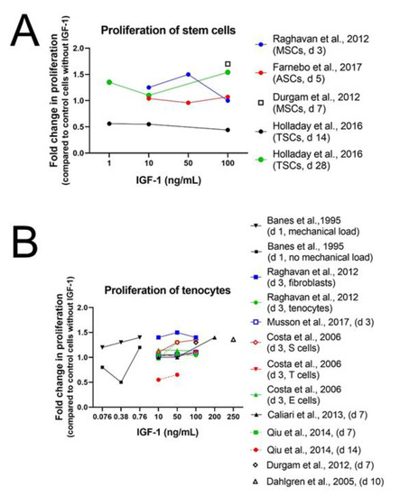 Results from Durgam et al. [76] and Raghavan et al. [77] confirm the positive effect of IGF-1 on cell proliferation. Equine MSCs, cultured with 100 ng/mL IGF-1 on a tendon matrix for 7 days, showed higher cell proliferation than cells without IGF-1 supplementation and also human adipose-derived stem cells (ASCs) proliferated more upon addition of IGF-1 (10, 50, and 100 ng/mL) than ASCs in the control medium on day 3 (Figure 2A). This effect was not dose-dependent though and was highest with 50 ng/mL compared to 10 and 100 ng/mL (Table S1). In contrast to the human stem cells, rat patellar tendon-derived stem cells (TSCs) did not show increased cell proliferation upon IGF-1 exposure (1, 10 and 100 ng/mL). Proliferation from day 0 to 14 was significantly less in the 100 ng/mL group than in the untreated cells. Fold change in cell numbers from seeding to analysis with 1 or 10 ng/mL IGF-1, respectively at day 14 and independently from the concentration at day 28 remained unaffected [78]. However, another experimental setup with rat ASCs confirmed the positive results of IGF-1 obtained with human ASCs. Lentivirus transduced rat ASCs reseeded in a tendon-specific hydrogel from human cadaver tendons had a significantly larger cell proliferation with best results using 100 ng/mL IGF-1 compared to cells without IGF-1 supplementation in serum-free media. However, optical density (OD) values of MTT proliferation assays with 100 ng/mL were not significantly higher than with 10 ng/mL and reached approximately the same intensity as for cells cultured in medium with fetal calf serum (FCS) without addition of IGF-1 [79]. Over all, IGF-1 seems to be able to improve cell proliferation of stem cells at higher concentrations but not all types of stem cells react in the same way. For instance, rat TSCs remained unaffected by treatment with 1 or 10 ng/mL IGF-1 and showed even a reduced cell proliferation with 100 ng/mL IGF-1.