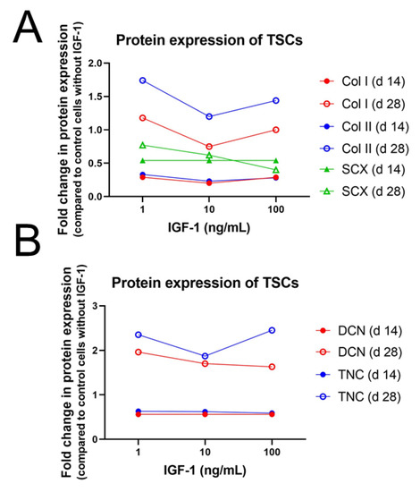 Impact of IGF-1 concentration on the protein expression of collagen I and II (col I and col II) and Scleraxis (SCX) (A) as well as Decorin (DCN) and Tenascin-C (TNC) after 14 or 28 days in rat tendon stem cell culture (TSC) in basal TSC medium [78] (B).