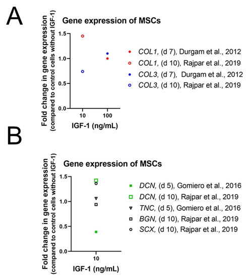 The limited potential of single IGF-1 supplementation to drive stem cells toward a tenogenic fate was confirmed as well in other species. In equine MSCs, gene expression levels of COL1, COL3, and COMP treated with 100 ng/mL IGF-1 remained unaffected [76] and also treatment with 10 ng/mL IGF-1 did not influence gene expression of tenogenic induction markers such as DNC, TNC, and EGR1 [87]. Experiments with equine MSCs, seeded on a collagen gel and treated with 10 ng/mL IGF-1, confirm these observations as gene expression levels of SCX, DCN, BGN, COL1, and COL3 did not differ from control cells [88] (Figure 4). Furthermore, Western Blot analysis of three-dimensional high-density cultures of canine MSCs did not show any synthesis of col I, col III, DCN, TNMD and SCX in contrast to canine tenocytes which served as control [89].