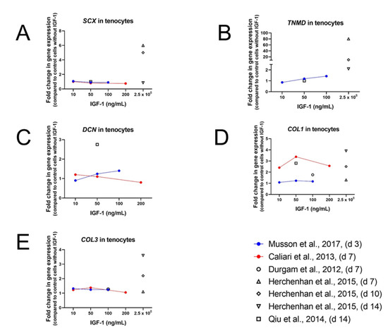 Results from Musson et al. [80] confirm the positive influence of IGF-1 on TNMD gene expression as rat tenocytes treated with 10, 50, or 100 ng/mL IGF-1 and 0.5% supplemented FBS showed increased TNMD levels on day 3. However, other tenocyte-related gene expression (SCX, COL1, COL3, DCN, and runt-related transcription factor-2 (RUNX2)) on day 3 remained unaffected after IGF-1 treatment at any dose. The expression of the osteoblastic marker alkaline phosphatase (ALP) and the chondrogenic marker aggrecan (ACAN) were significantly increased in a dose-dependent manner. On the other hand, expression levels of SOX9, a transcription factor essential for skeletal development among other things, decreased in a dose-dependent manner upon IGF-1 supplementation.