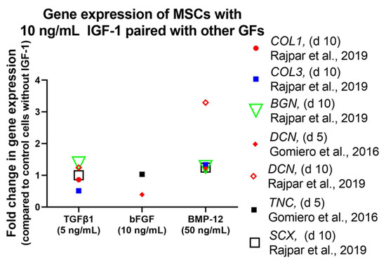 Impact of varying growth factor concentrations on the gene expression of human MSCs in the presence of 10 ng/mL IGF-1 and other growth factors as indicated. Further information: Equine MSCs in high-glucose DMEM containing 10% FBS and AA (37.5 µg/mL) [88] and equine tenocytes in DMEM containing 20% FCS [87].