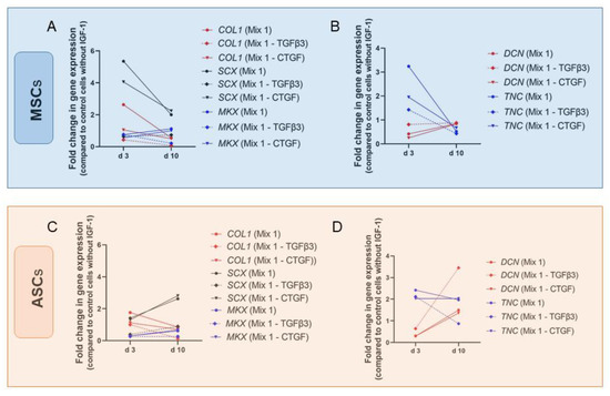 Importance of IGF-1 for tenogenic induction was also confirmed in human bone marrow-derived stromal cells (BMSCs) and ASCs. Perucca Orfei et al. tested several cell culture media containing different growth factors [103]. All mixtures contained 1% FBS, 25 µL/mL ascorbic acid (AA), 50 ng/mL PDGF-BB, 50 ng/mL BMP-12, and 5 ng/mL bFGF. Ascorbic acid plays an important role in wound healing and in collagen synthesis and therefore, AA is often present in tenogenic induction protocols [93,104,105]. Mixture 1 was additionally supplemented with 50 ng/mL IGF-1, 100 ng/mL CTGF, and 20 ng/mL TGFβ3. AA and CTGF are frequently used in differentiation media as it has been shown to activate tenogenic commitment and to improve tendon regeneration [106]. In mixture 3, TGFβ3 was missing and in mixture 5, CTGF was lacking otherwise they were identical to mixture 1. Mixtures without IGF-1 (mixture 4) and BMP-12 (mixture 2) showed no improvement on gene expression of SCX and DCN tenocytes and stem cells and therefore were not used for further experiments anymore. SCX expression was significantly increased in BMSCs after 3 days cultured with mixture 1 and 5 but not with mixture 3 lacking TGFβ3 though, this effect was not significant any more on day 10 (Figure 9). Levels of other markers such as DCN, Mohawk (MKX), TNC, and COL1 were not significantly changed by the different treatments at any time point what was also the case for ASCs (Figure 9D). As in BMSCs, upregulation of SCX could be detected in ASCs with mixture 1 and 5. In contrast, increase was higher on day 10 than on day 3, and values were not significantly higher than in the control group.