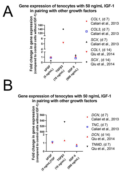 The important role of TGFβ3 in combination with IGF-1 has also been reported by Qiu et al. [84]. Human tenocytes in α-MEM without FBS but treated with 50 ng/mL IGF-1 and 10 ng/mL TGFβ3 increased gene expression levels of SCX, COL1, and TNMD remarkably after 14 days in culture (Figure 11), while supplementation with 50 ng/mL IGF-1 alone did not change expression levels of SCX and COL1. On the other hand, DCN was significantly increased upon treatment with 50 ng/mL IGF-1 and 10 ng/mL TGFβ3 but values were higher after supplementation with only 50 ng/mL IGF-1 (Figure 5D). Next to TGFβ3 also other growth factors were used with the goal to synergistically improve the effect of IGF-1. Whereas IGF-1 alone did not affect gene expression levels of tendon related genes in equine tenocytes, combination of 50 ng/mL IGF-1 with 500 ng/mL GDF-5 increased levels of COMP and SCX significantly (Figure 11A). Expression levels of DCN, TNC, COL3 were not affected and though col I was slightly upregulated effect was not significant (Figure 11B). Pairings of IGF-1 (50 ng/mL) with bFGF (5 ng/mL) showed a weak but not significant increase of TNC but no influence on expression levels of all other markers could be detected [82].