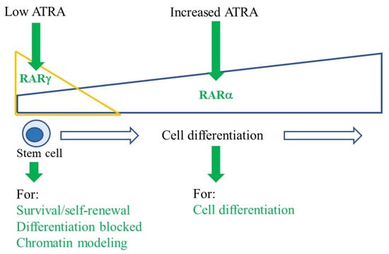 Active RARγ and RARα control stem cell maintenance and differentiation, respectively RARγ expression is restricted to stem cells and their immediate offspring, and as these cells differentiate, a fall in the expression of RARγ is mirrored by an increase in the expression of RARα. RARγ functions to maintain stem cells when ATRA is absent or low. ATRA activation of RARα promotes cell differentiation.