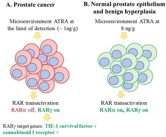 Patients’ prostate cancer cells reside in a low ATRA environment. For tumours, the intracellular level of ATRA is at or near the limit of detection (at ~1 ng/g tissue), and adjacent normal prostate epithelium cells and benign hyperplasia cells see ~8 times more. RARγ is activated at 0.24 nM ATRA and RARα at 19.3 nM. Evidence of RARγ usage within prostate cancer cells is that TIE-1 and the cannabinoid 1 receptor are overexpressed as shown by √.