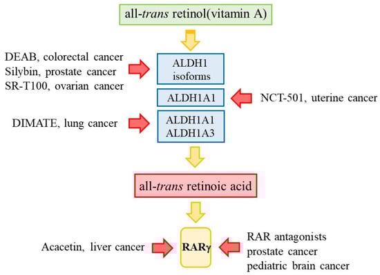 All-trans retinoic acid is a morphogen during embryogenesis and a teratogen. Cancer is an error of development, and the retinoic acid receptors (RAR) for all-trans retinoic acid play a role in cancer. Expression of the cytosolic aldehyde dehydrogenases, which mediate the last step to the synthesis of all-trans retinoic acid, is deregulated in various human cancers. Inhibiting these enzymes using a variety of agents reduced the proliferation of lung cancer cells, reduced the proliferation and induced apoptosis of ovarian, prostate, squamous, and uterine cancer cells, and sensitised breast, colorectal and ovarian cancer cells to chemotherapeutic agents. RARγ is an oncogene within some cases of AML, cholangiocarcinoma, colorectal cancer, clear cell renal cell carcinoma, hepatocellular carcinoma, pancreatic ductal adenocarcinoma, prostate cancer, and ovarian cancer. Pan-RAR and RARγ antagonist inhibition of the action of RARγ led to necroptosis of human prostate and pediatric brain tumour cancer stem cells. Treatment of hepatocellular carcinoma cells with the flavenoid acacetin, which interferes with the action of RARγ, decreased cell growth and induced apoptosis. Targeting the retinoic acid pathway is promising regarding the development of new drugs to eradicate cancer stem cells.