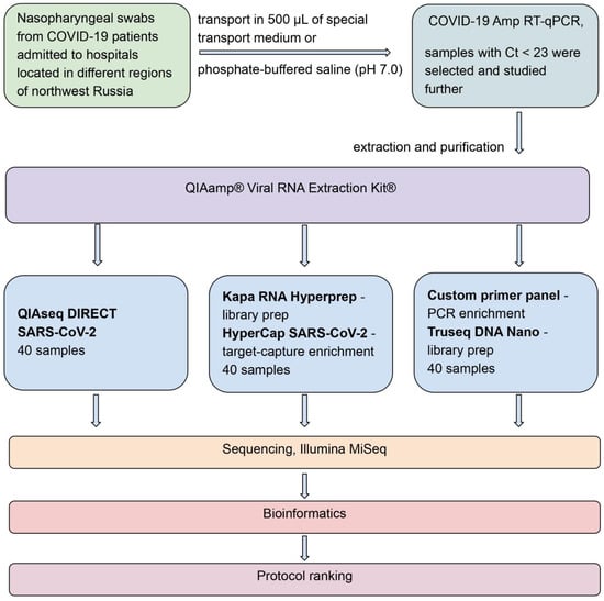 In this study, we evaluate several approaches for library preparation for SARS-CoV-2 whole genome sequencing using the Illumina MiSeq platform. We compared commercial kits from different manufacturers in terms of data quality, genomic coverage, SNP determination, number of reads, and sequencing depth. These were: the amplicon-based QIAseq DIRECT SARS-CoV-2 Kit (Qiagen, Hilden, Germany), the target capture-based KAPA HyperCap SARS-CoV-2 Kit (Roche, Mannheim, Germany), and a whole genome sequencing custom primer panel (developed by the authors) adapted to the TruSeq Nano DNA Library Preparation Kit (Illumina, San Diego, CA, USA). The study’s general design and workflow are shown in Figure 1.