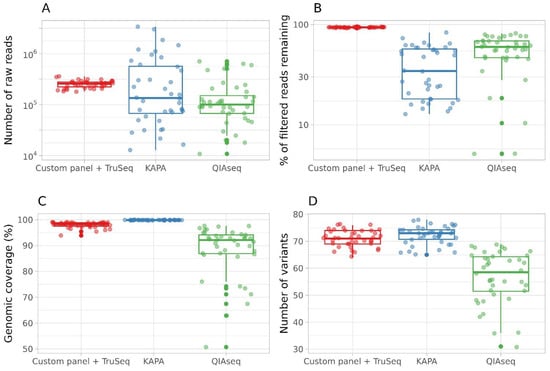 Comparison of the different library preparation kits. The x-axis shows the method. Boxplots show: (A)—number of raw reads achieved after Illumina MiSeq sequencing (y-axis is lg scaled); (B)—percent reads remaining after QC-trimming; (C)—percent SARS-CoV-2 genomic coverage; (D)—number of identified SNPs. Key: red—TruSeq DNA Nano Library Kit with custom primer panel; blue—KAPA HyperCap SARS-CoV-2; green—QIAseq DIRECT SARS-CoV-2.