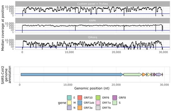 Median sequencing depth across the genome, depending on sample preparation method. The x-axis shows position in the SARS-CoV-2 genome and corresponding ORF. The y-axis shows median coverage (among 40 samples) by genomic position. The blue line represents a median coverage value of 5. A separate coverage graph is presented for each method.