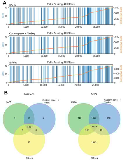 Comparison of SNP detection between different library protocols using all 40 samples. Panel (A) shows the presence of SNPs by genomic position (blue bars). The x-axis shows genomic position; the y-axis shows SNP calls. The height of the bars indicates the number of samples having calls at each position (left y-axis). The orange line shows the cumulative sum of variants along the length of the genome. Top—KAPA HyperCap SARS-CoV-2; middle—TruSeq DNA Nano Library Kit with custom primer panel; bottom—QIAseq DIRECT SARS-CoV-2. Panel (B) shows Venn diagrams showing the intersections of precise SNP positions (left) and the number of SNPs (right) between three methods.