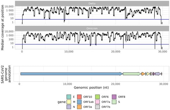 Median sequencing depth across the genome for Delta and Omicron SARS-CoV-2 samples prepared using the custom primer panel approach. The x-axis shows position in the SARS-CoV-2 genome. The y-axis shows median coverage (among 40 samples) by genomic position. The blue line represents a median coverage value of 5.