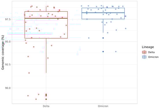 Genomic coverage for Delta and Omicron SARS-CoV-2 samples prepared with the custom primer panel approach. Boxplots shows percent genomic coverage for Delta (red) and Omicron (blue) variants.