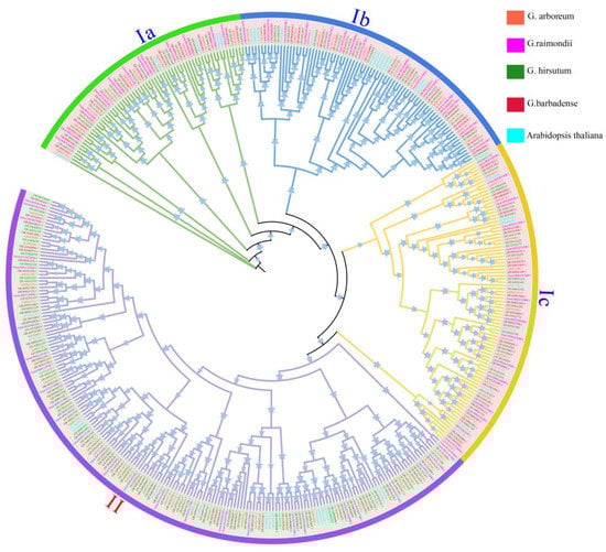 Phylogenetic tree of the ATP-binding cassette transporter G (ABCG) family in four Gossypium species and Arabidopsis. A total of 69, 71, 124 and 131 ABCG members identified in G. arboretum, G. raimondii, G. hirsutum and G. barbadense, respectively, together with 43 Arabidopsis ABCGs were submitted for phylogenetic analysis. Ia, Ib, Ic and II represent 4 subgroups.